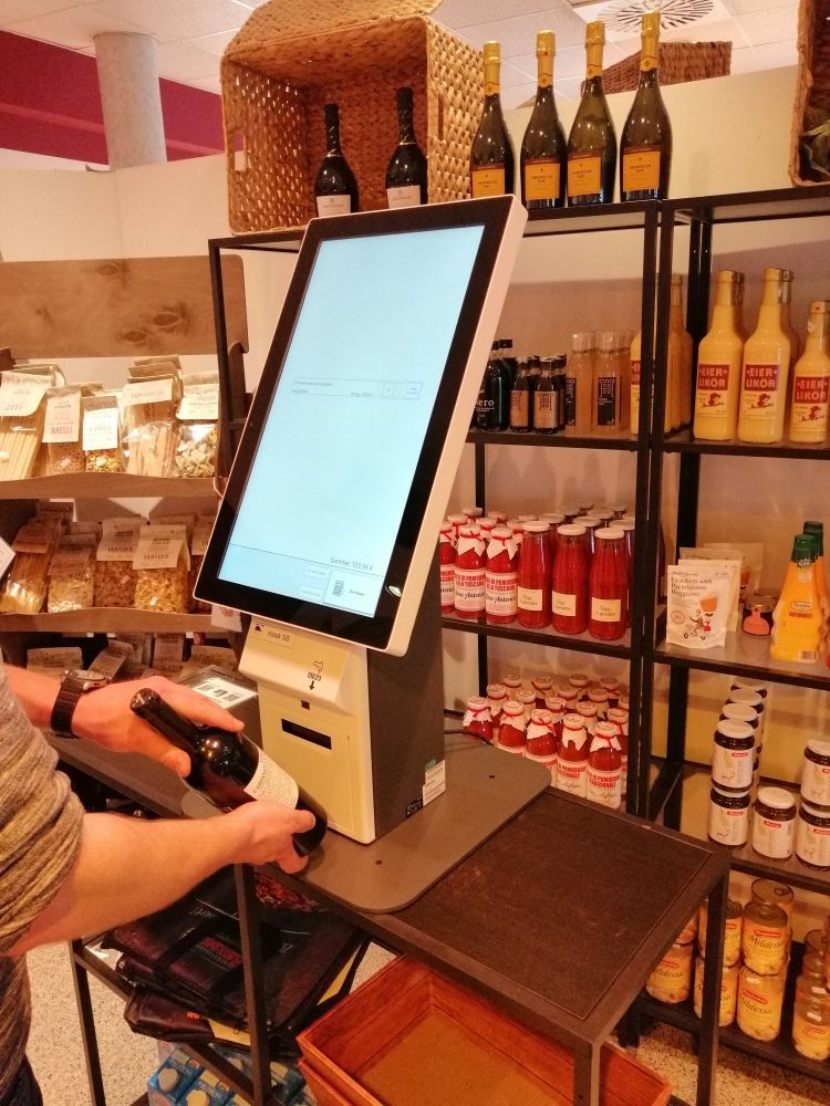 Produkte auswählen, wie im Supermarkt, und selbst an der Kasse scannen.